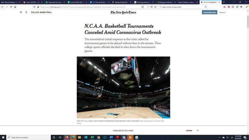 spread in the U.S. The article explains the cancellation of March Madness, the NCAA basketball
