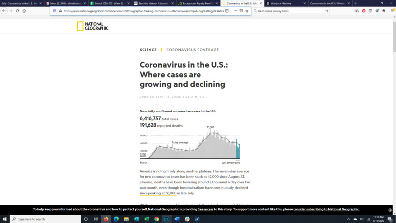 This article was published by National Geographic and made public by them to help spread awareness of the current state of the Coronavirus epidemic. This article is important because often information is gained second or third hand from someone who heard from someone who heard from someone else and by the time the information gets to you, the actual info is lost. National Geographic has long been known as a reputable source of information and so the information from them can usually be counted on to be accurate. Having an accurate source of information can help ease anxiety people may have simply from 'not knowing.' This article stated that, in the US, cases have been steady but with the cooler temperatures coming, may rise again as more people are spending their time primarily indoors. This article serves as a good snapshot of the current state of things in the coronavirus universe in September 2020.