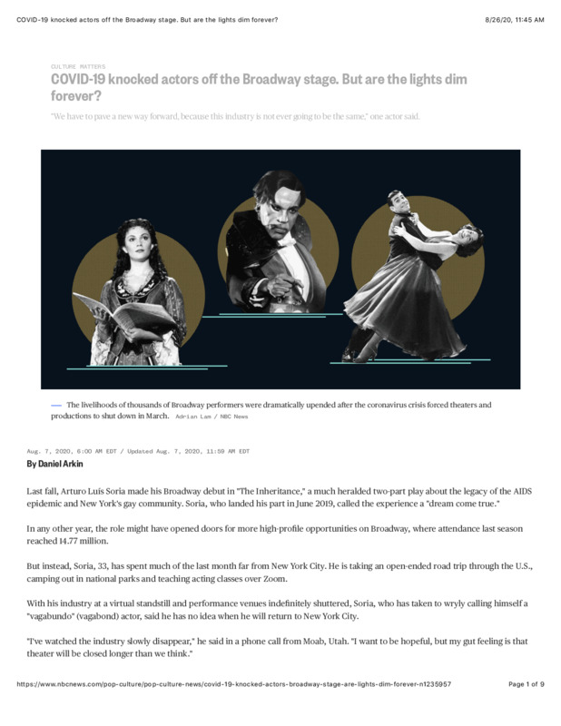 The news article is about the impacts the coronavirus pandemic had on Broadway and how it affected the people related to Broadway, the article also emphasizes the fact that the pandemic may have changed Broadway forever. This is important to me because when I was younger, my family and I used to go see shows every time we were in New York City, it was always a magical experience for me and my brother. This isn’t one of the most common ‘tragic outcomes’ of the pandemic, so I wanted to share the devastating losses that Broadway and the theatre community is experiencing due to the pandemic.