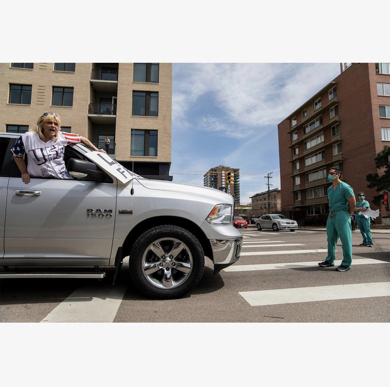 The photo shows nurses blocking an anti-lockdown protest in Denver. This picture is one of many photos taken the afternoon of April 19th, 2020. The protesters argued that they should be able to go out and get haircuts, have a drink at the bar, eat at a restaurant, and so on. The protesters argued that the mandatory stay-at-home and wearing of face masks went against their constitutional rights. One woman held up a sign saying, “land of the free” and shouted “This is a free country. Land of the free. Go to China if you want communism.” All the while the nurses stood silently in the cross walks during red lights in their scrubs and N95 masks, trying to show the effects and severity of Covid-19. This photo shows a mere glimpse of the anti-lockdown protests. The contrasting arguments of personal health vs. public health