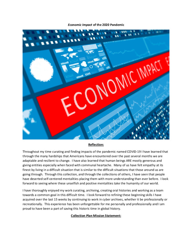 Throughout my time curating and finding impacts of the pandemic named COVID-19 I have learned that through the many hardships that Americans have encountered over the past several months we are adaptable and resilient to change. I have also learned that human beings ARE mostly generous and giving entities especially when faced with communal heartache. Many of us have felt empathy at its finest by living in a difficult situation that is similar to the difficult situations that those around us are going through. Through this collection, and through the collections of others, I have seen that people have deserted self-centered mentalities placing them with more understanding than ever before. I look forward to seeing where these unselfish and positive mentalities take the humanity of our world.