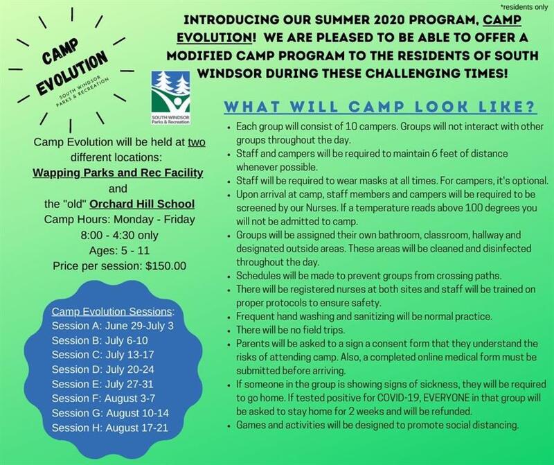 In high school, I worked for South Windsor Parks and Recreation as a program leader for the before and after school program, as well as a camp counselor during the summers. On March 12, 2020, Governor Ned Lamont announced that schools will be closed beginning that Monday, March 16, for at least two weeks due to COVID-19. This included my program, putting me and all of my coworkers out of a job during this time (and, eventually, the rest of the school year), and taking away the childcare that so many South Windsor families depended on, including my own. I was a senior in high school when this happened, trying to work as much as possible to save up for college. My department was working hard to create an alternative within our state's guidelines to remain open and operating without compromising the safety of our employees and families. Unfortunately, COVID-19 was too unpredictable at the time and we had no idea how to protect everyone other than shutting down completely. For months, my coworkers and I heard nothing from our supervisors, as they had no new information to give us. On May 22, 2020, we were sent this flyer with information about a modified summer camp for 2020, called "Camp Evolution," with guidelines covering group sizes, social distancing expectations, and mask mandates. Many former counselors made the decision to not return for camp, including myself, as I lived with my grandparents at the time who, in addition to being in their 80s, also had preexisting conditions. I also know of many program leaders who will not be returning to our before and after school program due to similar concerns. The camps and programs have also been finding themselves short on participants, as most families in South Windsor are concerned about the virus, and many are currently working from home, so they no longer require the same childcare as before. For many families with parents who are not able to work remotely, such as my own, are thankful for these program reopenings, as well as the smaller group numbers that come with them. I am proud of my department for working so hard to keep their employees and families safe while also continuing to provide services for those most in need.