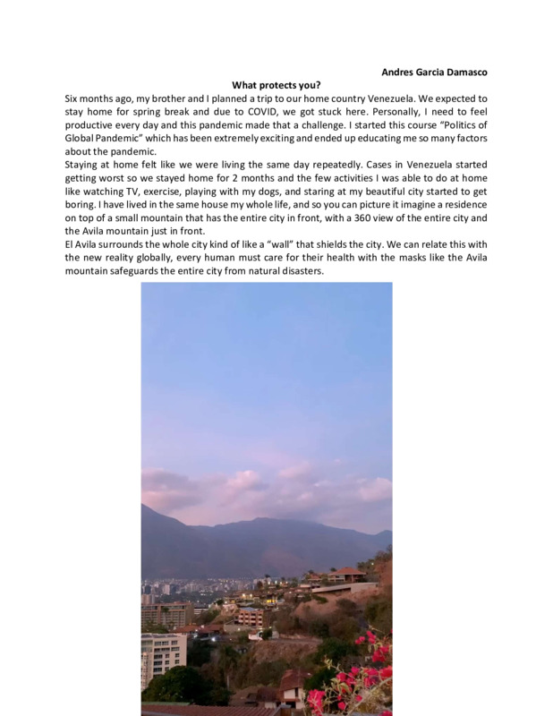 This story is very significant for me as its something that I never thought i would have lived, a pandemic. I was very lucky of passing this past six months in my home with my family where I have learned to value everything a lot I spend most of the time in my home. What I have uploaded is a video from a very recognized mountain called el Avila which happens to be my every morning view from my balcony. El Avila represents protection to our city, the same way the mask is protection for us in these very critical moments.