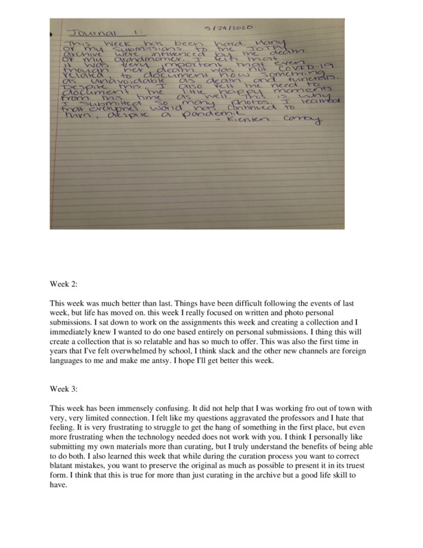 I have thoroughly enjoyed my work curating, archiving, creating oral histories and working as a team towards a common goal in this difficult time. I look forward to refining these beginning skills I have acquired over the last 15 weeks by continuing to work in cyber archives, whether it be professionally or recreationally. This experience has been unforgettable for me personally and professionally and I am proud to have been a part of saving this historic time in global history.