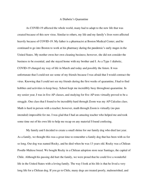 Before the pandemic started, I was a senior in high school. I had just asked my girlfriend to prom, which was just a few months away, and I had a 4.5 gpa for my senior year compared to my 3.5 for the rest of high school. I was excited to run spring track and try to break 5 minutes in the mile for the first time in high school. I hung out nearly everyday with my best friends. I had just committed to Suffolk University and was excited for the future.