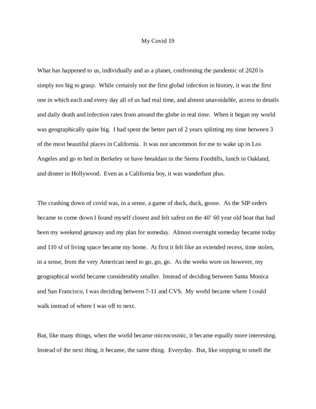 COVID-19 has made me question the paradox of the heart as an emotional or love centered force that exists in all mankind. I am writing as a Biological Science Major, PreMed student at Arizona State University and as a part of Religion, Culture, and Public Life course where I have been given the opportunity to share my story to ‘A Journal to the Plague Year’. In this course we study what is rational thought as it pertains to religion, spiritualism and the conditions of the heart in retrospect to whether or not man can do good for mankind without the need to also do bad to mankind. I lost several friends through this year and diagnosis. Some of them have never returned a text or call and others called me a liar and some laugh at my symptoms when I tell them. Then there are those that laugh at posts of people in hospital beds and turn their noses up to simple fever checks at local businesses. CoronaVirus would not be complete however had it not also brought out a global connection of assistance. Mortgages and rents are suspended, utilities are not being disconnected, the government is sending cash assistance and our food and medical welfare services have expanded to all in need. The Small Business Associations in combined efforts are bailing out businesses left and right with grants to the tune in the billions. For once in history the little man, the big man, the poor man, the rich man, the athlete, the teacher...all of us were in need and all of us were susceptible to the same affliction; COVID-19.