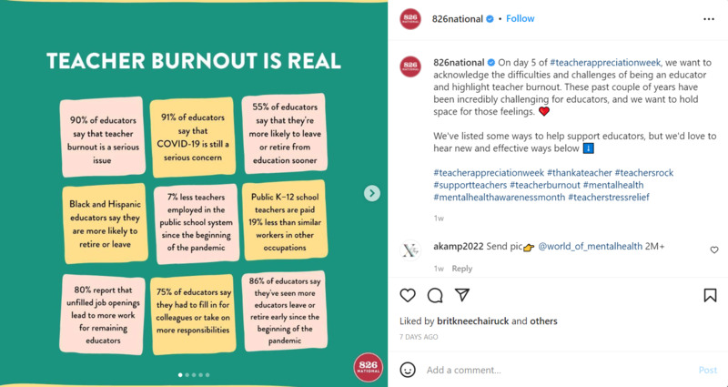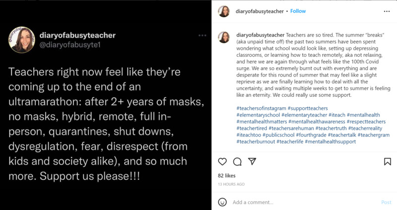 In this post, they highlight statistics related to teacher burnout and stress during the second year of the pandemic. One of the most alarming statistics is that 90% of teachers that participated say that teacher burnout is a serious issue. The pandemic has exacerbated the stress put on educators and they have received little support in return.