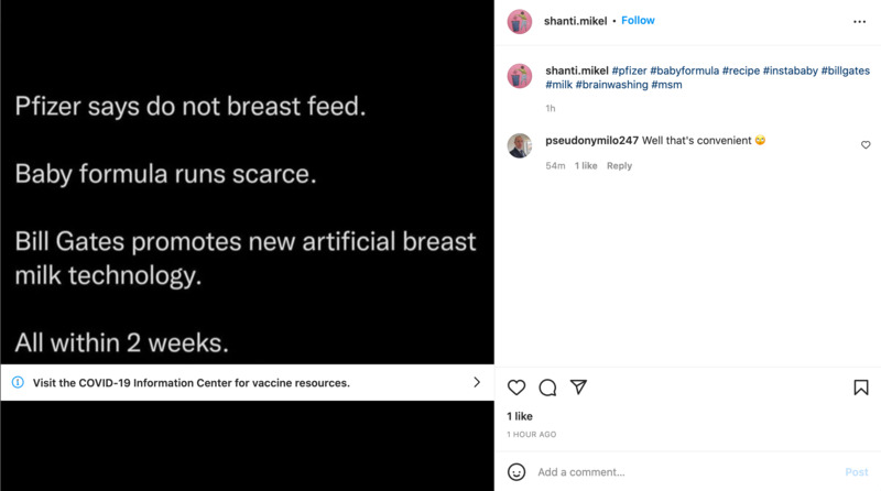 This is an Instagram post by shanti.mikel. This post is on a conspiracy that the baby formula shortage is being used by Bill Gates to promote artificial breast milk technology. Connected to this theory is Pfizer advising people to not breast feed. I would be curious to know what the vaccine's impact would be on breast feeding in the future, as mRNA vaccines like the one Pfizer has produced are going to be used to treat other diseases. The claim that breast feeding is not recommended with COVID vaccines originated in Britain's medicines regulator, not Pfizer, according to Reuters. In order to give more context to this post, I have posted the story by Reuters as well, for those interested in reading.