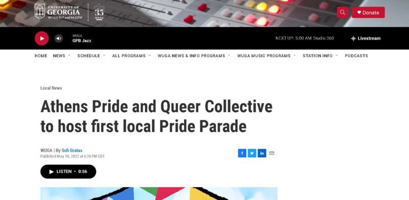 This is a news story from WUGA by Sofi Grates. According to this article, it says that Pride Month will be back in full swing in Athens after it being canceled due to COVID. It will be hosted by Athens Pride and Queer Collective. The parade that is sent for June 12 will include vendors, music, and a cookout