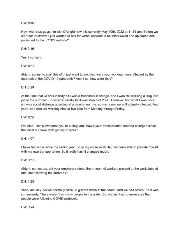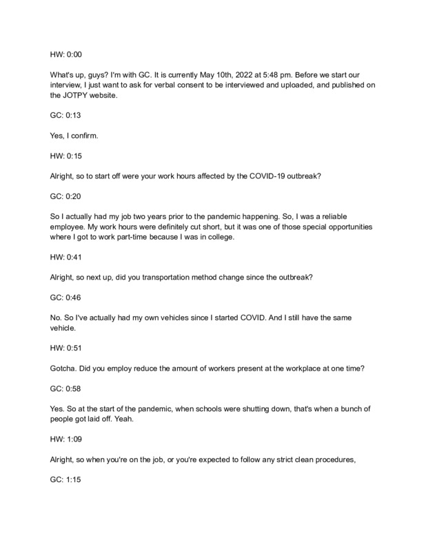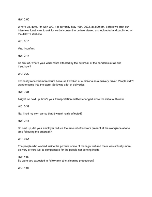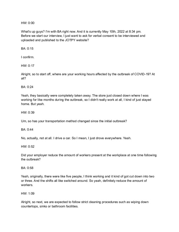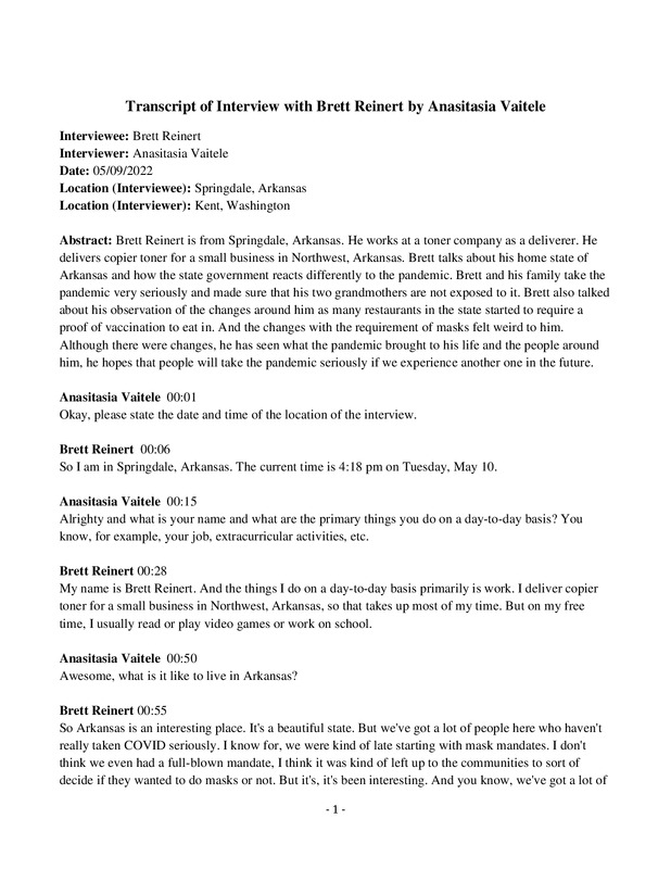 Brett Reinert is from Springdale, Arkansas. He works at a toner company as a deliverer. He delivers copier toner for a small business in Northwest, Arkansas. Brett talks about his home state of Arkansas and how the state government reacts differently to the pandemic. Brett and his family take the pandemic very seriously and made sure that his two grandmothers are not exposed to it. Brett also talked about his observation of the changes around him as many restaurants in the state started to require a proof of vaccination to eat in. And the changes with the requirement of masks felt weird to him. Although there were changes, he has seen what the pandemic brought to his life and the people around him, he hopes that people will take the pandemic seriously if we experience another one in the future
