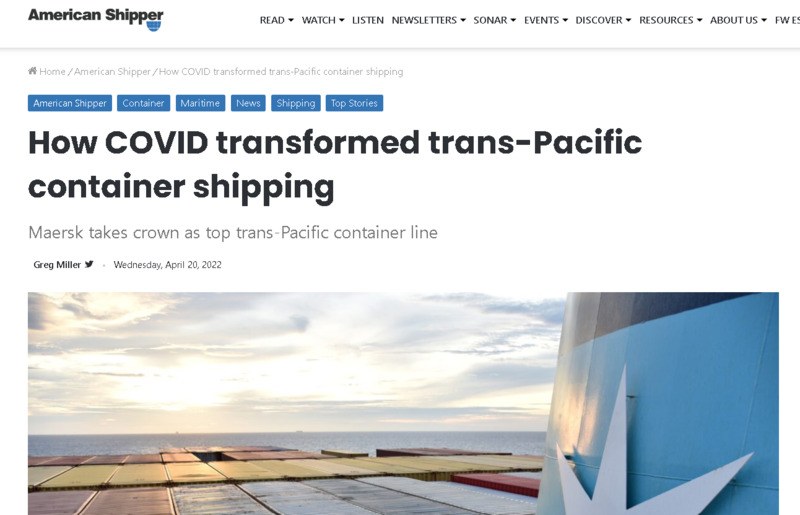 This is a news story from American Shipper by Greg Miller. Due to COVID, our trade has changed. Data from Alphaliner shows how much the trade relationship between Asia and the United States has morphed. Carrier competition is up, with more players and less share from the three global alliances.