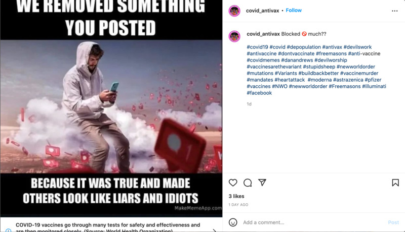 This is an Instagram post by covid_antivax. This post is in criticism of social media removing posts deemed "misinformation" about COVID and the vaccine. The tags from this user, like #depopulation, suggest that the goal of COVID and the vaccines is to reduce the population size.