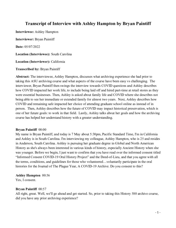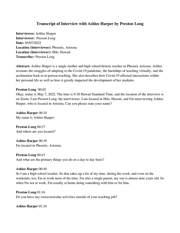 Ashlee Harper is a single mother and high school history teacher in Phoenix Arizona. Ashlee recounts the struggles of adapting to the Covid-19 pandemic, the hardships of teaching virtually, and the acclimation back to in-person teaching. She also describes how Covid-19 affected interactions within her personal life as well as how it greatly impacted the development of her students.