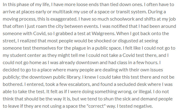 In this phase of my life, I have more loose ends than tied down ones. I often have to arrive at places early or multitask my use of a space or transit system. During a moving process, this is exaggerated. I have so much schoolwork and shifts at my job that often I just roam the city between events. I was notified that I had been around someone with Covid, so I grabbed a test at Walgreens. When I got back onto the street, I realized that most people would be shocked or disgusted at seeing someone test themselves for the plague in a public space. I felt like I could not go to my student center as they might tell me I could not take a Covid test there, and I could not go home as I was already downtown and had class in a few hours. I decided to go to a place where many people are dealing with their own issues publicly; the downtown public library. I knew I could take this test there and not be bothered. I entered, took a few escalators, and found a secluded desk where I was able to take the test. It felt as if I were doing something wrong, or illegal. I do not think that should be the way it is, but we tend to shun the sick and demand people to leave if they are not using a space the "correct" way. I tested negative.