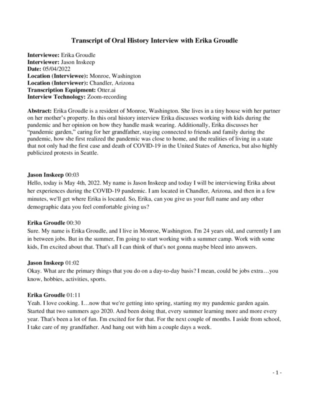 Erika Groudle is a resident of Monroe, Washington. She lives in a tiny house with her partner on her mother’s property. In this oral history interview Erika discusses working with kids during the pandemic and her opinion on how they handle mask wearing. Additionally, Erika discusses her “pandemic garden,” caring for her grandfather, staying connected to friends and family during the pandemic, how she first realized the pandemic was close to home, and the realities of living in a state that not only had the first case and death of COVID-19 in the United States of America, but also highly publicized protests in Seattle.