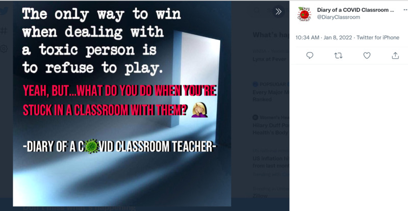 The item is a screenshot from a Twitter post of someone known as "Diary of a COVID Classroom Teacher". For their post, they had edited a motivational photo to question how to handle a toxic person if they are in your classroom.