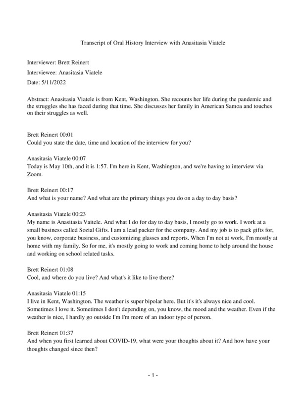 Anasitasia Viatele is from Kent, Washington. She recounts her life during the pandemic and the struggles she has faced during that time. She discusses her family in American Samoa and touches on their struggles as well.