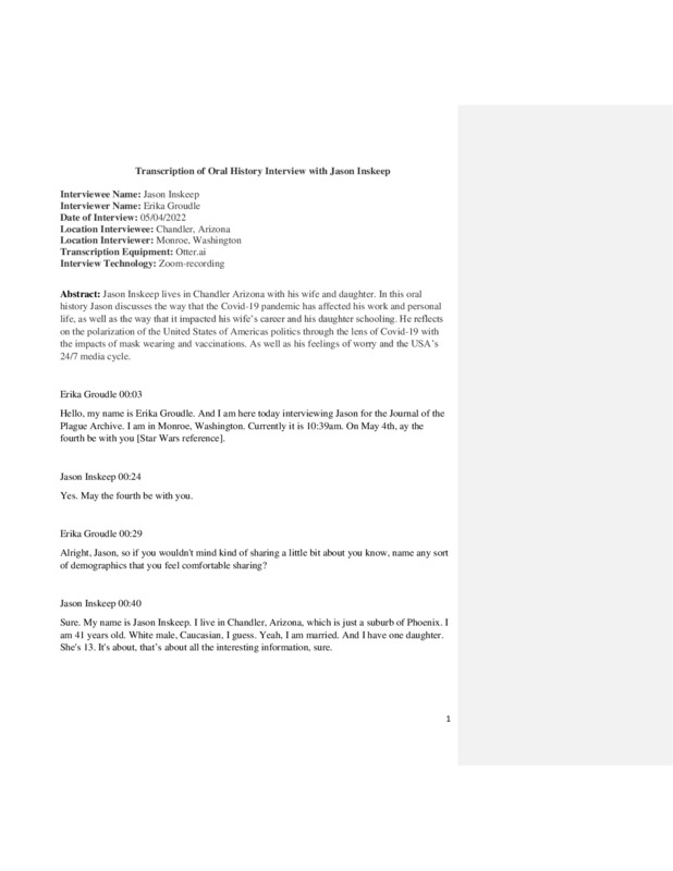 Jason Inskeep lives in Chandler, Arizona with his wife and daughter. In this oral history Jason discusses the way that the Covid-19 pandemic has affected his work and personal life, as well as the way that it impacted his wife’s career and his daughter schooling. He reflects on the polarization of the United States of Americas politics through the lens of Covid-19 with the impacts of mask wearing and vaccinations. As well as his feelings of worry and the USA’s 24/7 media cycle.