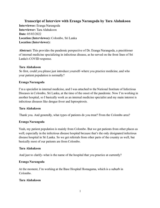 It provides the pandemic perspective of Dr. Eranga Narangoda, a practitioner of internal medicine specializing in infectious disease, as he served on the front lines of Sri Lanka's COVID response.