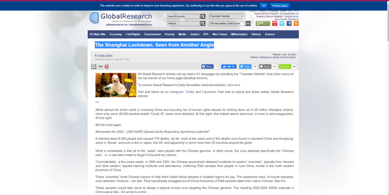 This is a screenshot of an article from globalresearch.ca about looking at the most recent Shanghai Lockdown. Yet, the article does not talk about the Shanghai lockdown until maybe halfway through the article. It goes on a tirade about how the 2002-2004 SARS outbreak went after the "Chinese race" and how it became an early trial for China before COVID. Then the author states that China has "mastered the disease" and managed to reopen its economy by the end of 2020, which leads to the conclusion that China's economic growth hardly suffered during the newest outbreak. The author asserts that China will surpass the U.S. economy in 3-4 years and then launches into a world history lesson about Cold War politics.