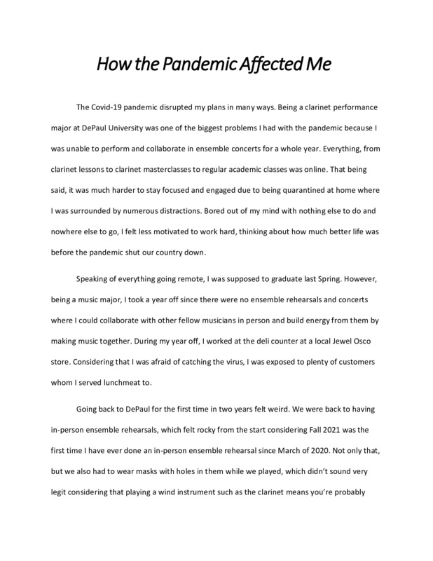 It's about the Pandemic disrupting my plans for graduating from college with a Bachelor's Degree in Music Performance. Being a clarinet player, I took a year off since the pandemic prevented us, musicians, from collaborating live with each other in person.