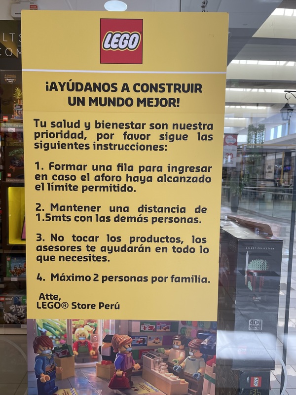 This is a sign listing COVID precautions on the door of the LEGO store at Mall Aventura. The instructions ask people to make a line to come inside, social distance, not touch products, and that a maximum of two people per family enter the store. I like the image at the bottom of the LEGO characters wearing masks.