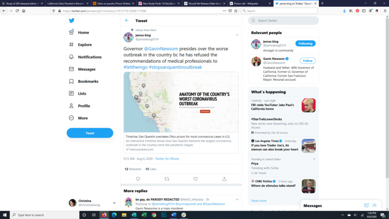 A 74 year old man who was incarcerated in a medical facility was transferred to San Quentin in an effort to keep him away from Covid, but the botched transfer resulted in the opposite. He contracted Covid and was sent to a local hospital. While there the medical staff facilitated Zoom calls and the like with his family. After being transferred to the ICU the medical staff said because he was incarcerated they could not facilitate contact with his family. His daughter explains more.
