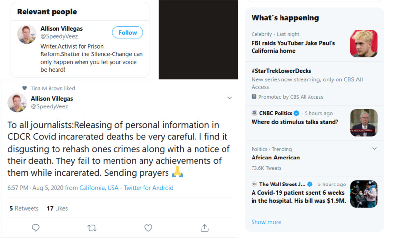 These images show the Tweets of an incarcerated person sharing their experience during the Covid Pandemic using a contraband cell phone. This week he talks about the guards delivering food to their cells and leaving it on the floor, the inmates response, their lack of access to showering, the lack of compassion, encouraging people to vote and hold politicians accountable, medical emergencies, death, and the general feeling of anger.