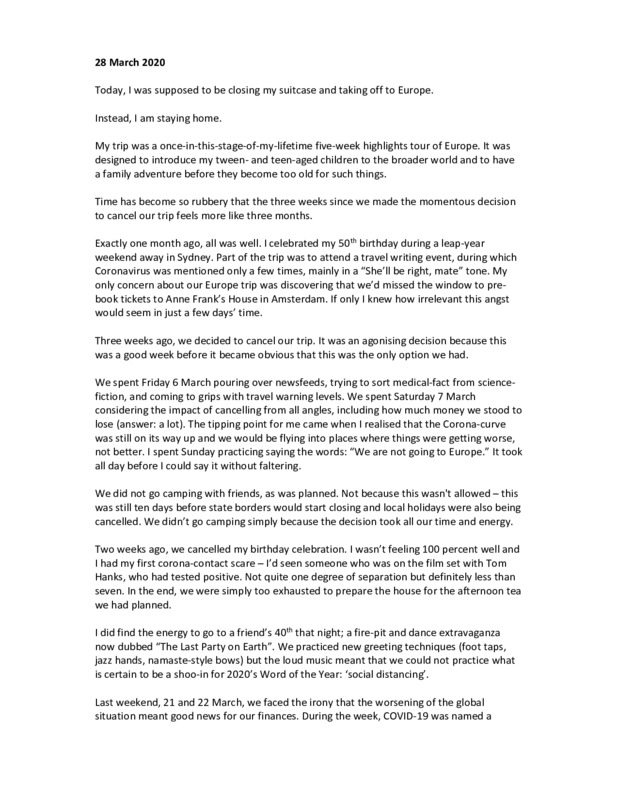 I wrote this story for Womankind magazine's online 'Life in Lockdown' site. It is my reflection on my decision to cancel my long-planned overseas family adventure in the very early days of the pandemic. I wish I'd kept a better diary of this time so I'm glad I wrote this piece.