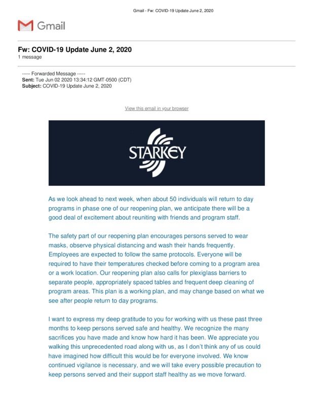 As spring gave way to summer in 2020, Starkey gradually opened its day programs for its persons-served in phases, so as to ensure their safety as much as possible. These emails dated June 2 to July 14, 2020, offer a look into a seemingly steady and successful reopening process, while illustrating the patchwork nature of Kansas's reopening, and how individual entities charted their own course while following the state's suggested guidelines. Perhaps most tellingly, the final email conveys the sudden pullback brought about by the virus's continued surge, when the day programs closed yet again due to rapidly rising COVID-19 cases in Sedgwick County, Kansas. Taken together, these items give substance to a quickly deteriorating situation that came to characterize the COVID-19 experience in Sedgwick County during the COVID summer of 2020.