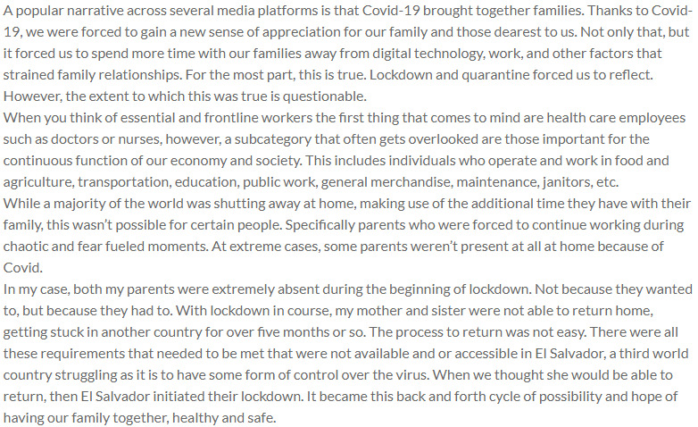 My father on the other hand had to continue showing up to work, working ridiculous hours. When the whole world including my father was consumed by fear and confusion, there was no room to process and plan. My father, an employee of a multinational beverage corporation, experienced no change in his routine. On the contrary, besides wearing a mask, everything remained the same; crowded working spaces, no social distancing, etc. My sisters and I questioned why he continued to go to work knowing the danger that posses to not only his health and safety but also ours. His reason was “because the world doesn’t stop. There are still expenses and bills to pay regardless so not showing up is not an option.” This made me question just how many parents continue to work because they need the money to survive, especially at the beginning of the pandemic when many businesses were taking advantage of the short supply of items such as disinfecting spray, wipes, toilet paper, etc. and committing price gouging, knowing people were desperate for such things. That being said, stories as such continue to expose the disproportionate disadvantages that many low income communities and working classes face. Not only that but the additional strains placed on several families because of Covid and just how important resource and accessibility is.