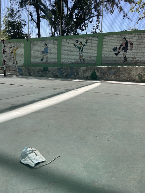 After a game of soccer, that ended when the ball was kicked out of bounds and landed on cactus (rendering the ball flat), I took this picture of a disposable mask left behind on the soccer field.