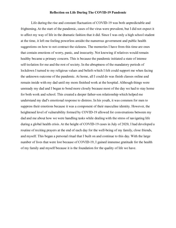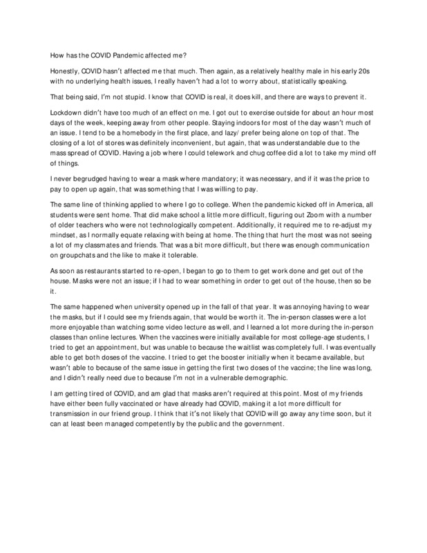 When the pandemic began about two years ago, I vividly remember thinking, "Okay, this should not last very long." But I was completely wrong. The pandemic took a lot of things from society, the ability to operate like we would normally would and instilled a fear that many of us had never experience. In my situation, it took the opportunity to have a traditional freshman college experience. Although, it allowed me to have classes on-line and have flexibility in my schedule, it took the one- in a lifetime experience of going from high school to post-secondary education and experiencing all that goes with that transition. This was a dream for me to accomplish, attending a recognized institution and having that ability to dorm, make friends, experience the college life. However, this pandemic made that possibility very surreal. This pandemic in a way was a reality check for me. Never once did I ever think that this type of situation would happen, you heard about it but you always thought about this like if it were something in the past.