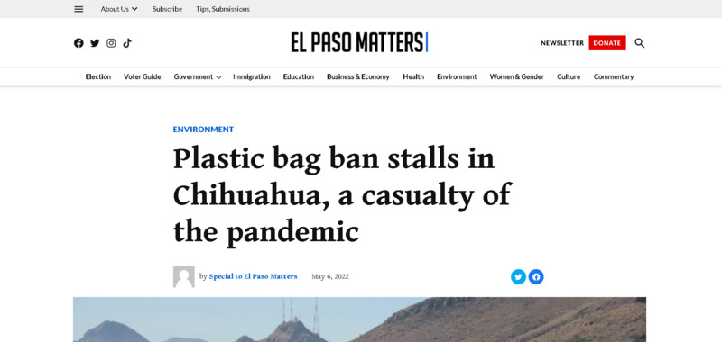 This is a news story from El Paso Matters. This story is about Mexico's environmental issues that have risen due to COVID. In August 2019, Chihuahua became the latest state to ban single-use plastic bags. This changed with COVID, when household and medical waste rose to 80,000 tons per day.