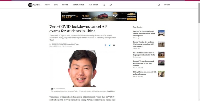 This is a news story from ABC News by Carolyn Thompson. Due to China's COVID policy, the Advanced Placement (AP) tests have been canceled due to restrictions. Students are unable to visit for in-person tests that are used for AP tests. The College Board offered an online version of these tests, but that was only intended to be temporary. Some tests are being offered digitally, such as the ACT. The SAT remains impacted due to restrictions. Parents have accused The College Board of being indifferent to affected students that need these tests.