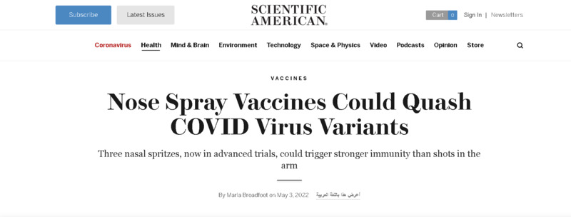 This is a news story from The Scientific American by Marla Broadfoot. With the effectiveness of vaccines waning due to new variants coming about, scientists have been coming up with new ways to combat the virus. Scientists are thinking of developing a nose spray vaccine that attacks the virus at the source. It is believed that a vaccine delivered this method could trigger mucosal immunity. Nasal vaccines have been shown in the past to be more effective than traditional administration of vaccines. There is risk in this, however, because there still needs to be more research done on mucosal immunity. The advantage is that this vaccine does not rely on syringes or needles, so it has the possibility of reaching more people.
