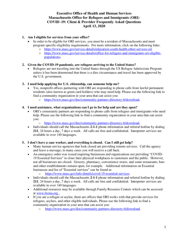 The Executive Office of Health and Human Services Massachusetts Office for Refugees and Immigrants published an FAQ about immigrant and refugee rights in Massachusetts during the COVID pandemic. Some answers given include: the closing of the border to refugees and how to seek citizenship during this time.