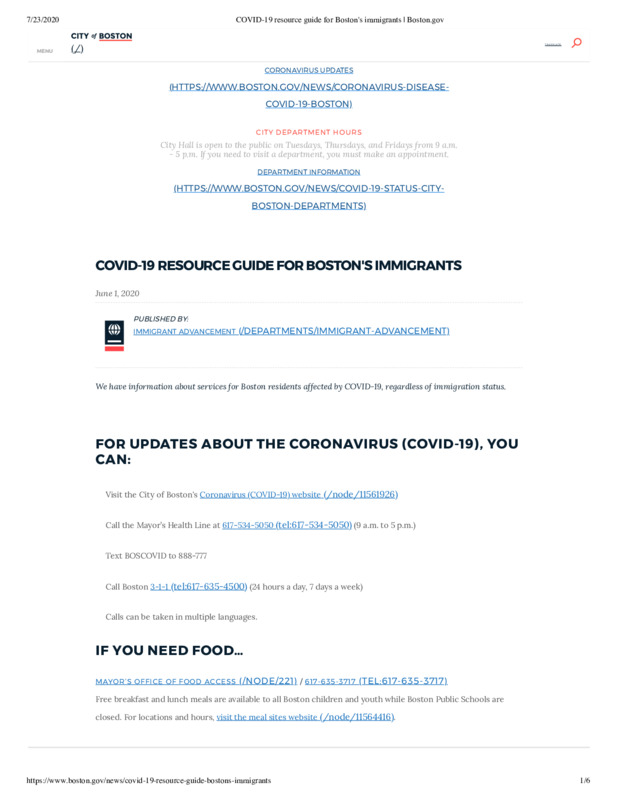 The Immigrant Advancement office at the Boston Mayor's office posted a resource guide for Boston immigrants. Immigrant communities have been hit hard by the pandemic as many of those in the community are essential workers who have continued to work throughout the pandemic. The guide includes resources for those in need of food, childcare, medical care, and immigration help.