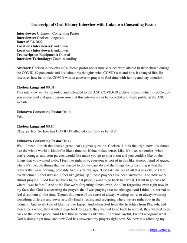 This is an oral history interview I conducted with a law enforcement officer and fellow ASU intern. He is in the History Master's program at ASU with me and it gives the perspective of not only a law officer but also one who lives in a very rural area in the United States during the pandemic.