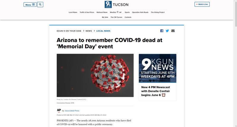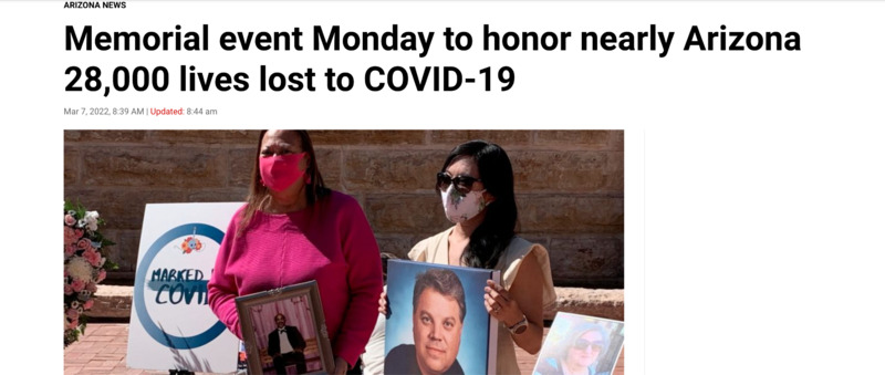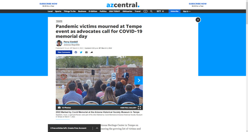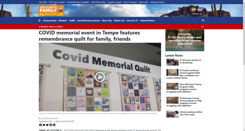 This article is about the Covid Memorial Quilt exhibit at the Arizona Heritage Center in Tempe. The Arizona Heritage Center is a museum of the Arizona Historical Society. This article describes the quilt and the memorial event held on Monday, March 7, 2022. The event was sponsored in part by the non-profit group Marked by Covid which honors those who have died of Covid 19. Almost 28,000 Arizonans have died of Covid as of March 7th.
