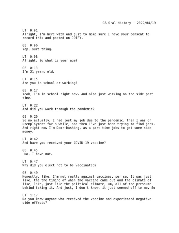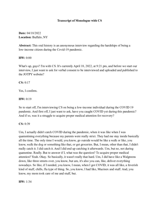 This oral history is an anonymous interview regarding the hardships of being a low-income citizen during the Covid-19 pandemic.