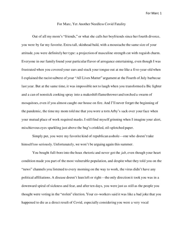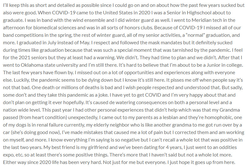 I’ll keep this as short and detailed as possible since I could go on and on about how the past few years sucked but also were good. When COVID-19 came to the United States in 2020 I was a Senior in Highschool about to graduate. I was in band with the wind ensemble and I did winter guard as well. I went to Meridian tech in the afternoon for biomedical sciences and was in all sorts of honors clubs. Because of COVID-19 I missed all of our band competitions in the spring, the rest of winter guard, all of my senior activities, a “normal” graduation, and more. I graduated in July instead of May. I respect and followed the mask mandates but it definitely sucked during times like graduation because that was such a special moment that was tarnished by the pandemic. I feel for the 2021 seniors but they at least had a warning. We didn’t. They had time to plan and we didn’t. After that I went to Oklahoma state university and I’m still there. It’s hard to believe that I’m about to be a Junior in college. The last few years have flown by. I missed out on a lot of opportunities and experiences along with everyone else. Luckily, the pandemic seems to be dying down but I know it’s still here. It pisses me off when people say it’s not that bad. One death or millions of deaths is bad and I wish people respected and understood that. But sadly, some don’t and they take this pandemic as a joke. I have yet to get COVID and I’m very happy about that and don’t plan on getting it ever hopefully. It’s caused de watering consequences on both a personal level and a nation wide level. This past year I had other personal experiences that didn’t help which was that my Grandma passed (from heart condition) unexpectedly, I came out to my parents as a lesbian and they’re homophobic, one of my dogs is in renal failure currently, my elderly neighbor who is like another grandma to me got run over by a car (she’s doing good now), I’ve made mistakes that caused me a lot of pain but I corrected them and am working on myself, and more. I know everything I’m saying is so negative but I can’t recall a whole lot that was positive in the last two years. My best friend is my girlfriend and we’ve been dating for 4 years, I just went to an oddities expo, etc. so at least there’s some positive things. There’s more that I haven’t said but not a whole lot more. Either way since 2020 life has been very hard. Not just for me but everyone. I just hope it goes up from here.