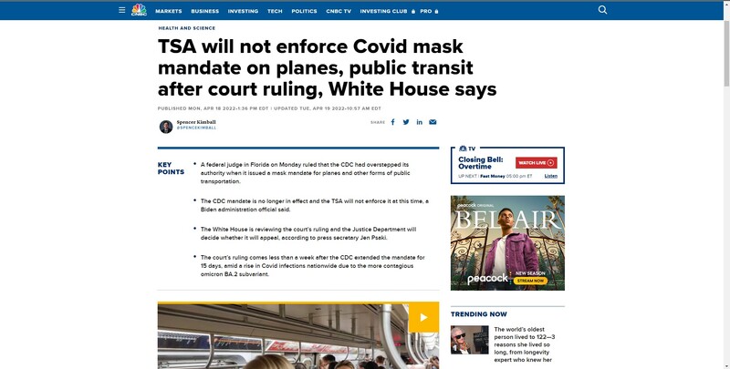 This is a news story from CNBC by Spencer Kimball. It says that the TSA will not enforce the COVID mask mandate on planes after a court ruling by a federal judge in Florida. The CDC, however, still recommends people wear masks while using public transit. The US District Judge Kathryn Kimball Mizelle said that the CDC failed to provide adequate reasons for the mandate. White House Press Secretary Jen Psaki says that the White House will appeal this ruling, with the Justice Department determining if ti will appeal.