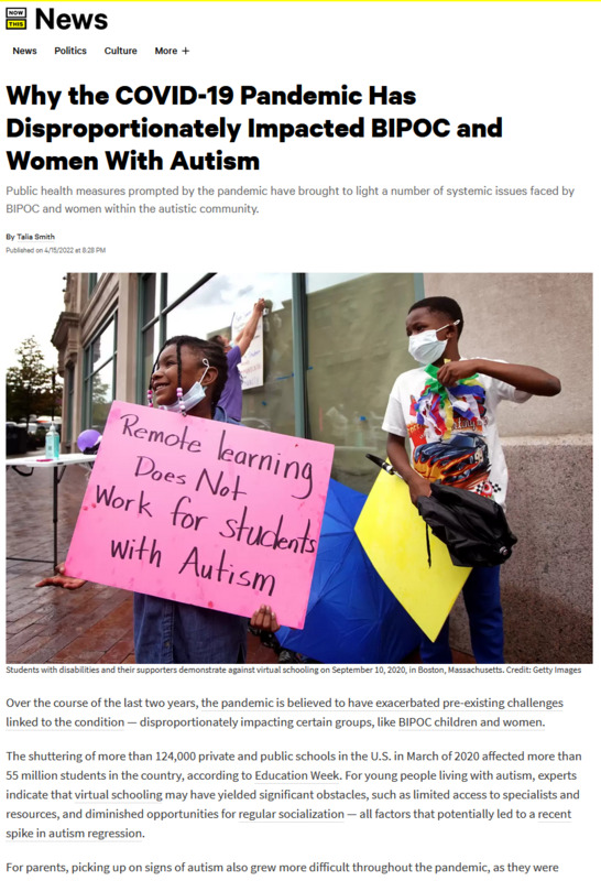 This is a news story from Now This News by Talia Smith. The author says that over the course of the pandemic, BIPOC and autistic women have been disproportionately affected. BIPOC parents who were not able to work remotely struggled to support their autistic children.