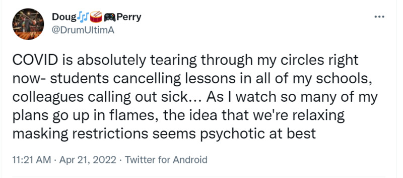This a screenshot of a Twitter post. In the post, @DrumUltimA describes how even in April 2022, COVID-19 is still having major effects on different aspects of his life. He also points out that he disagrees with so many precautionary measures being dropped.