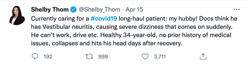 This is a Twitter update from Shelby_Thom. She says that her husband became a long-haul COVID patient. He got vestibular neuritis, which causes severe dizziness. He is unable to work or drive. He was a healthy 34-year-old too prior to this, but now hits his head a few days after recovery.