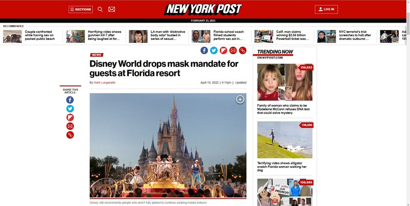 This is a news story from The New York Post by Mark Lungariello. This is about Disneyworld lifting the mask mandate for the parks. It says that vaccinated guests have the option of wearing a mask or not. However, public transportation, like the monorail and buses, will still require masks. This change comes not long after a federal judge ruled against the mask mandates in Florida.