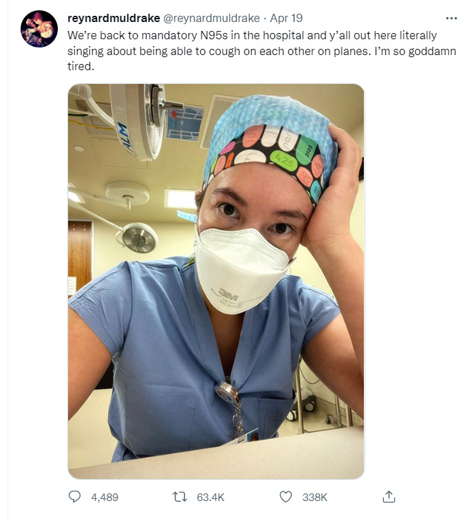 A Twitter user, who works in a hospital, shares her frustrations after masks are no longer federally required on planes. Many people are happy about this ruling, but others, especially those on the "frontlines" in the hospitals, are expressing their frustrations with people acting as if the pandemic is over.