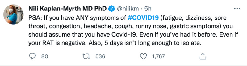 This is a Twitter update by nilikm. This person is a doctor warning people about the symptoms associated with COVID. The doctor advises people to assume they have COVID-19 anyway if they experience the following symptoms, even if they have had it before. The final piece of advice is to isolate longer than five days, as this doctor does not believe that is enough time.