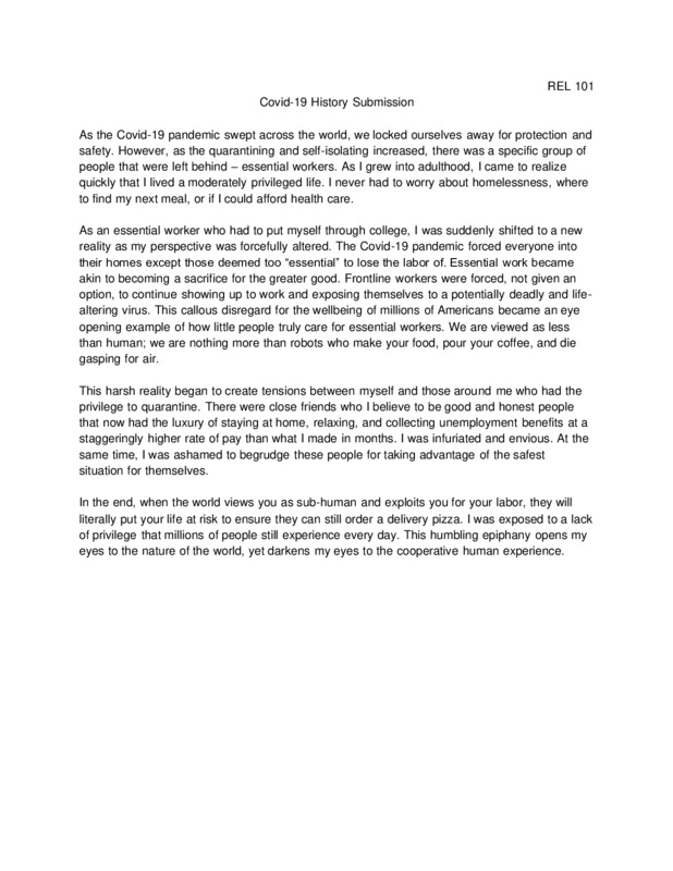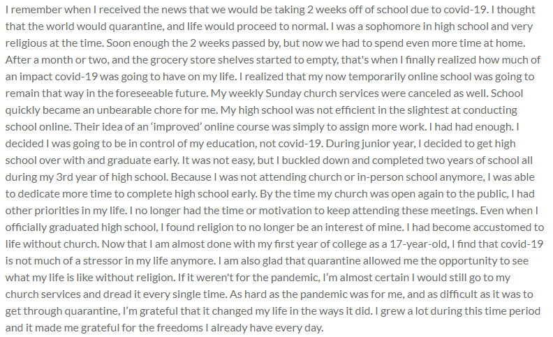 I remember when I received the news that we would be taking 2 weeks off of school due to covid-19. I thought that the world would quarantine, and life would proceed to normal. I was a sophomore in high school and very religious at the time. Soon enough the 2 weeks passed by, but now we had to spend even more time at home. After a month or two, and the grocery store shelves started to empty, that's when I finally realized how much of an impact covid-19 was going to have on my life. I realized that my now temporarily online school was going to remain that way in the foreseeable future. My weekly Sunday church services were canceled as well. School quickly became an unbearable chore for me. My high school was not efficient in the slightest at conducting school online. Their idea of an ‘improved’ online course was simply to assign more work. I had had enough. I decided I was going to be in control of my education, not covid-19. During junior year, I decided to get high school over with and graduate early. It was not easy, but I buckled down and completed two years of school all during my 3rd year of high school. Because I was not attending church or in-person school anymore, I was able to dedicate more time to complete high school early. By the time my church was open again to the public, I had other priorities in my life. I no longer had the time or motivation to keep attending these meetings. Even when I officially graduated high school, I found religion to no longer be an interest of mine. I had become accustomed to life without church. Now that I am almost done with my first year of college as a 17-year-old, I find that covid-19 is not much of a stressor in my life anymore. I am also glad that quarantine allowed me the opportunity to see what my life is like without religion. If it weren't for the pandemic, I’m almost certain I would still go to my church services and dread it every single time. As hard as the pandemic was for me, and as difficult as it was to get through quarantine, I’m grateful that it changed my life in the ways it did. I grew a lot during this time period and it made me grateful for the freedoms I already have every day.